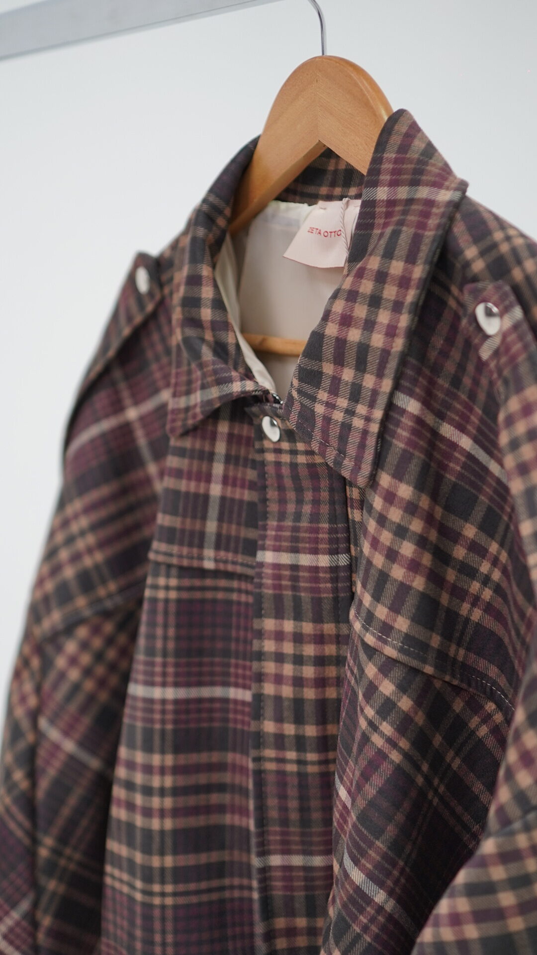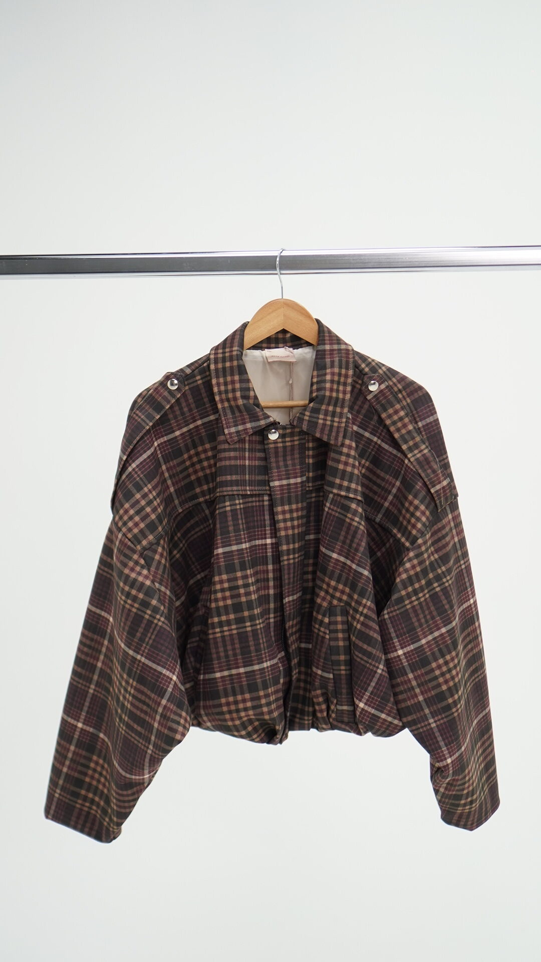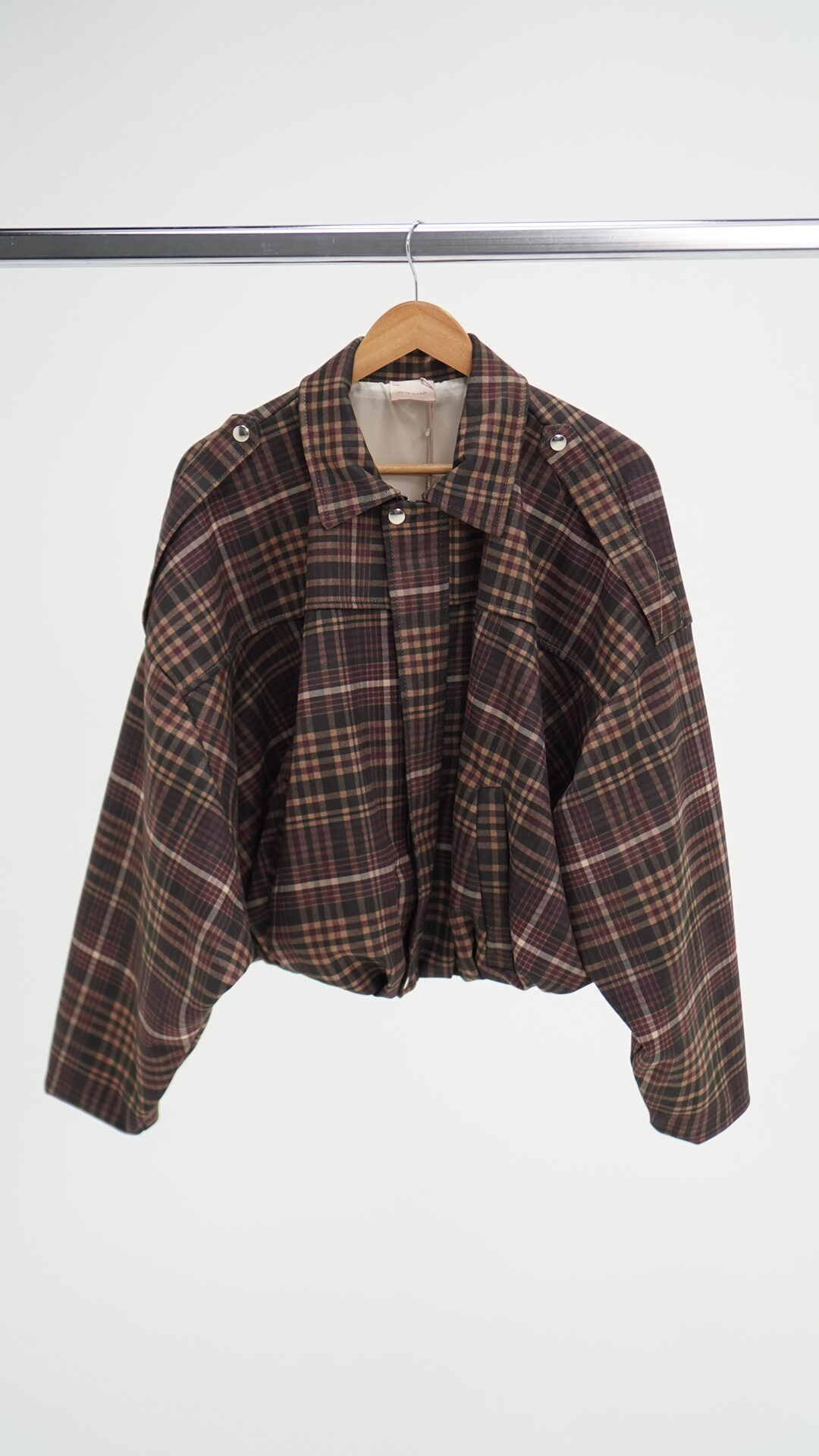 Bomber oversize a scacchi bordeaux, marrone, beige e bianco, taglia unica.