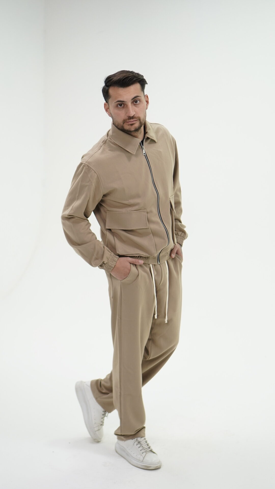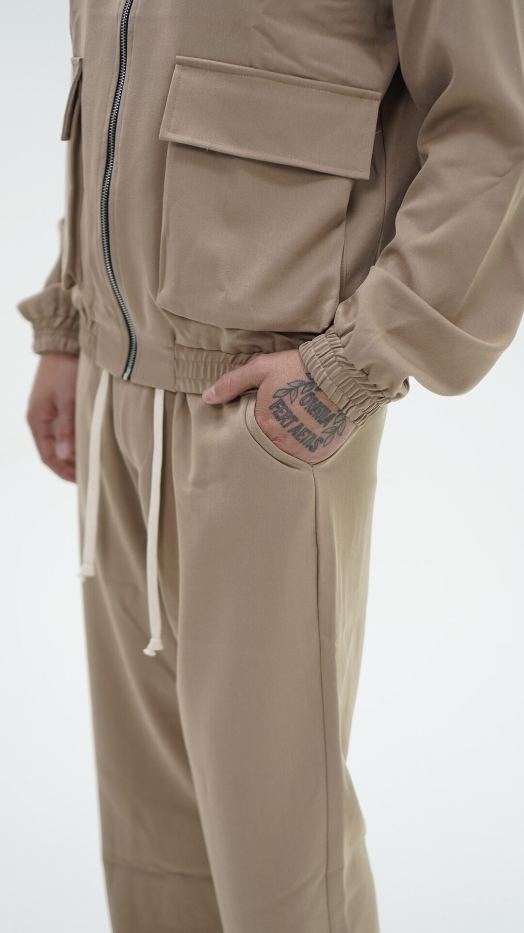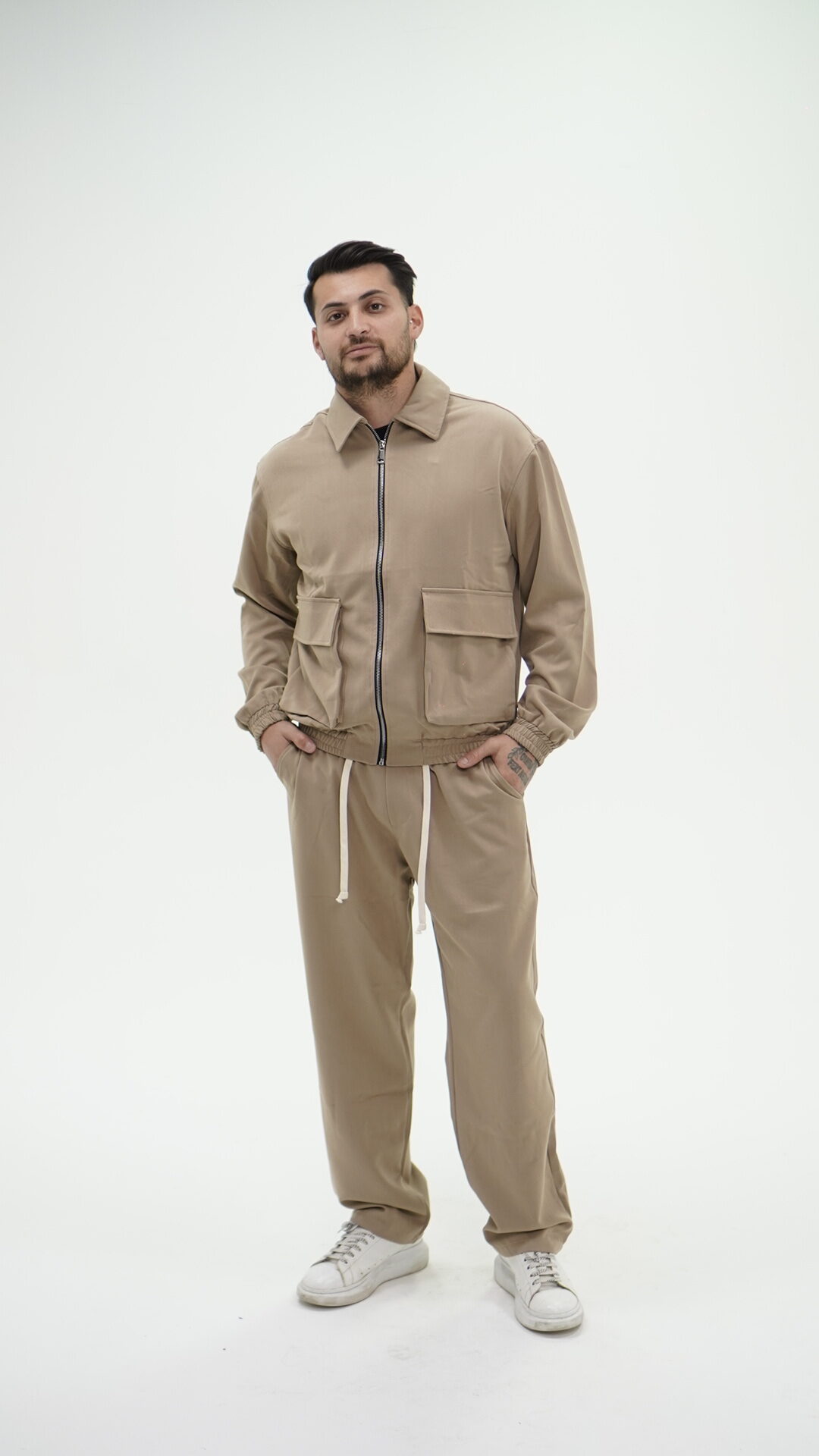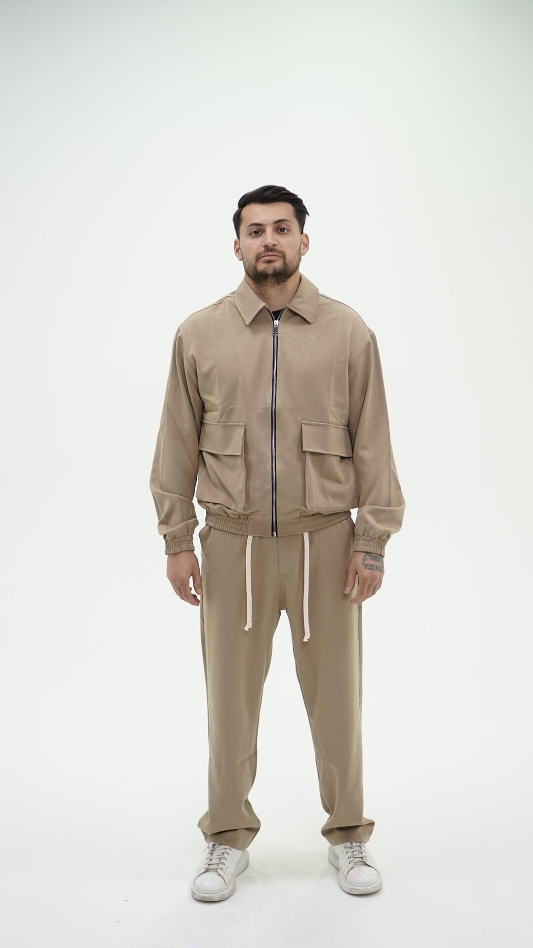 Coordinato due pezzi, giacca con Zyp con tascone frontali, pantalone largo.