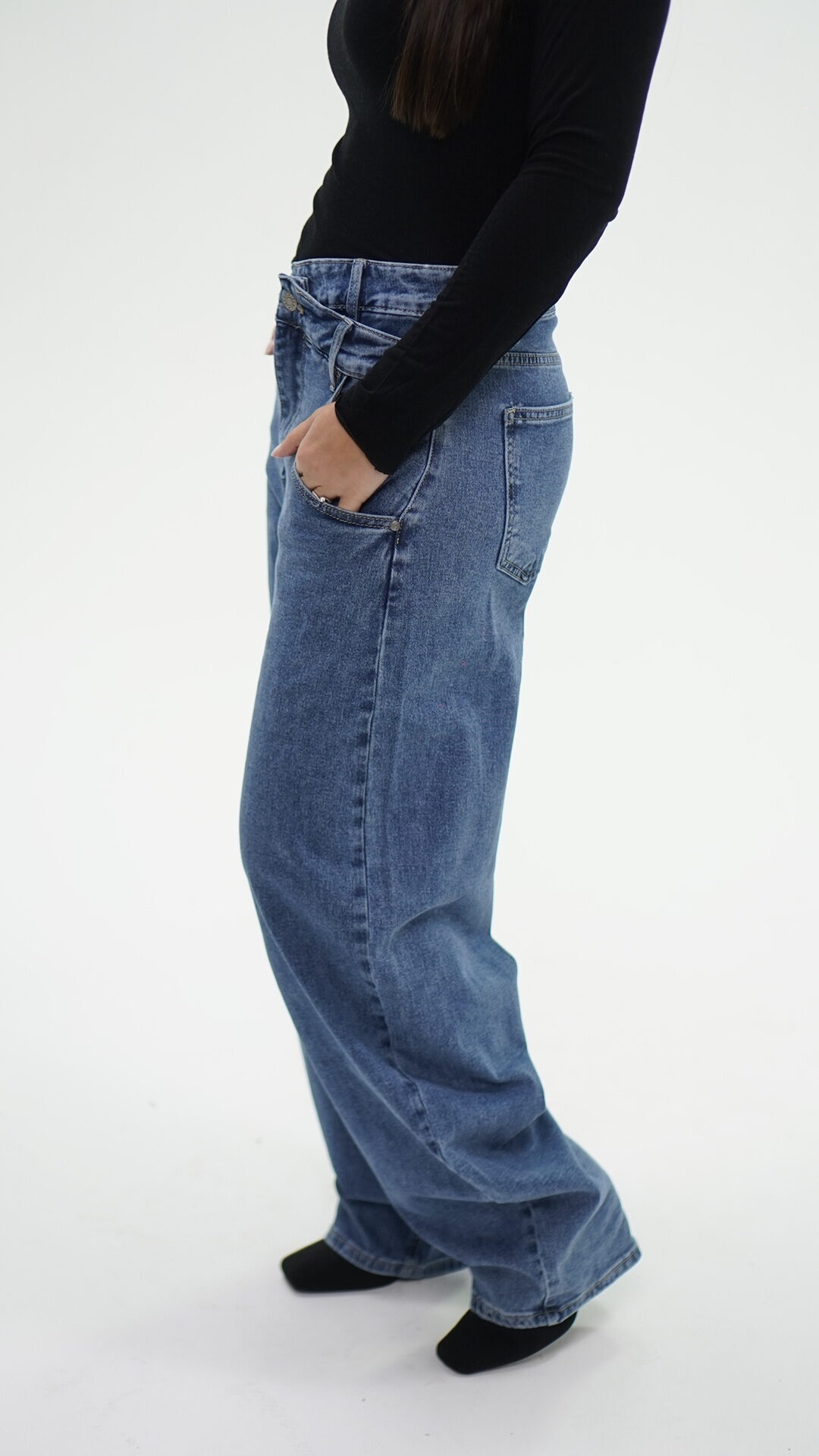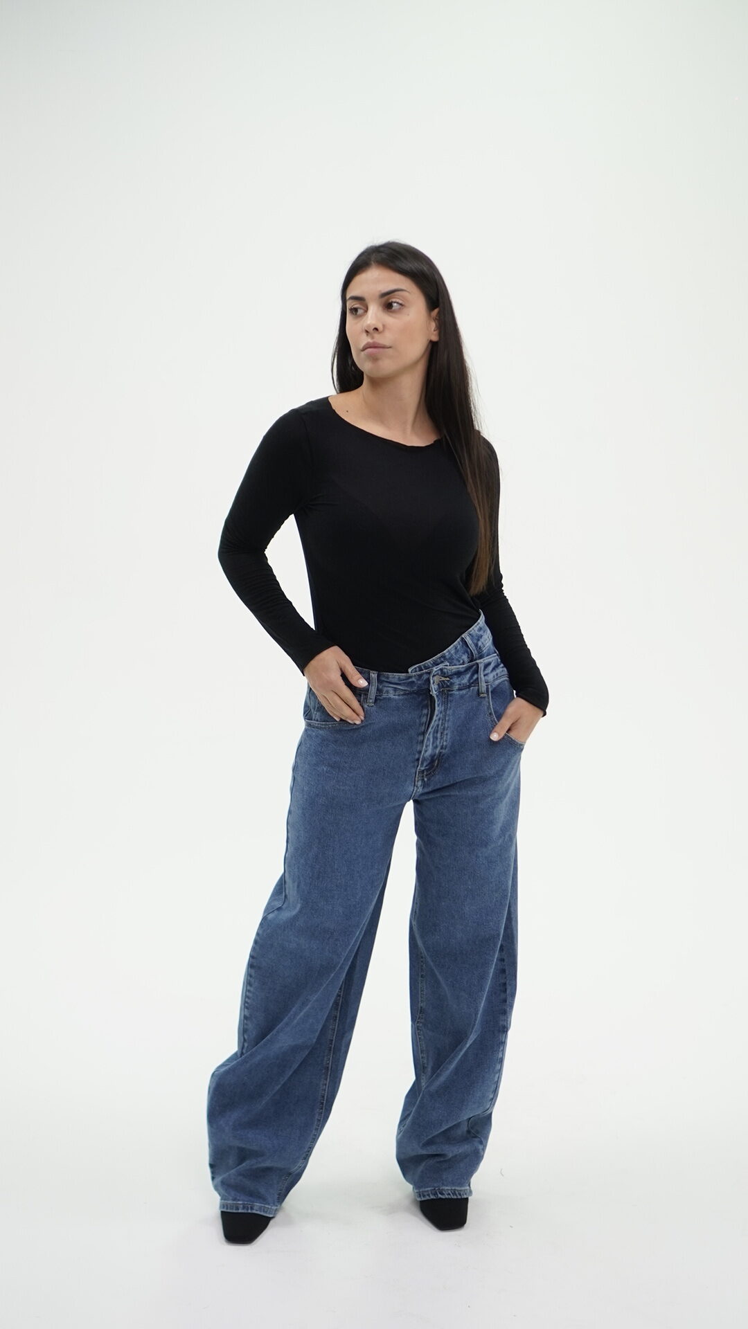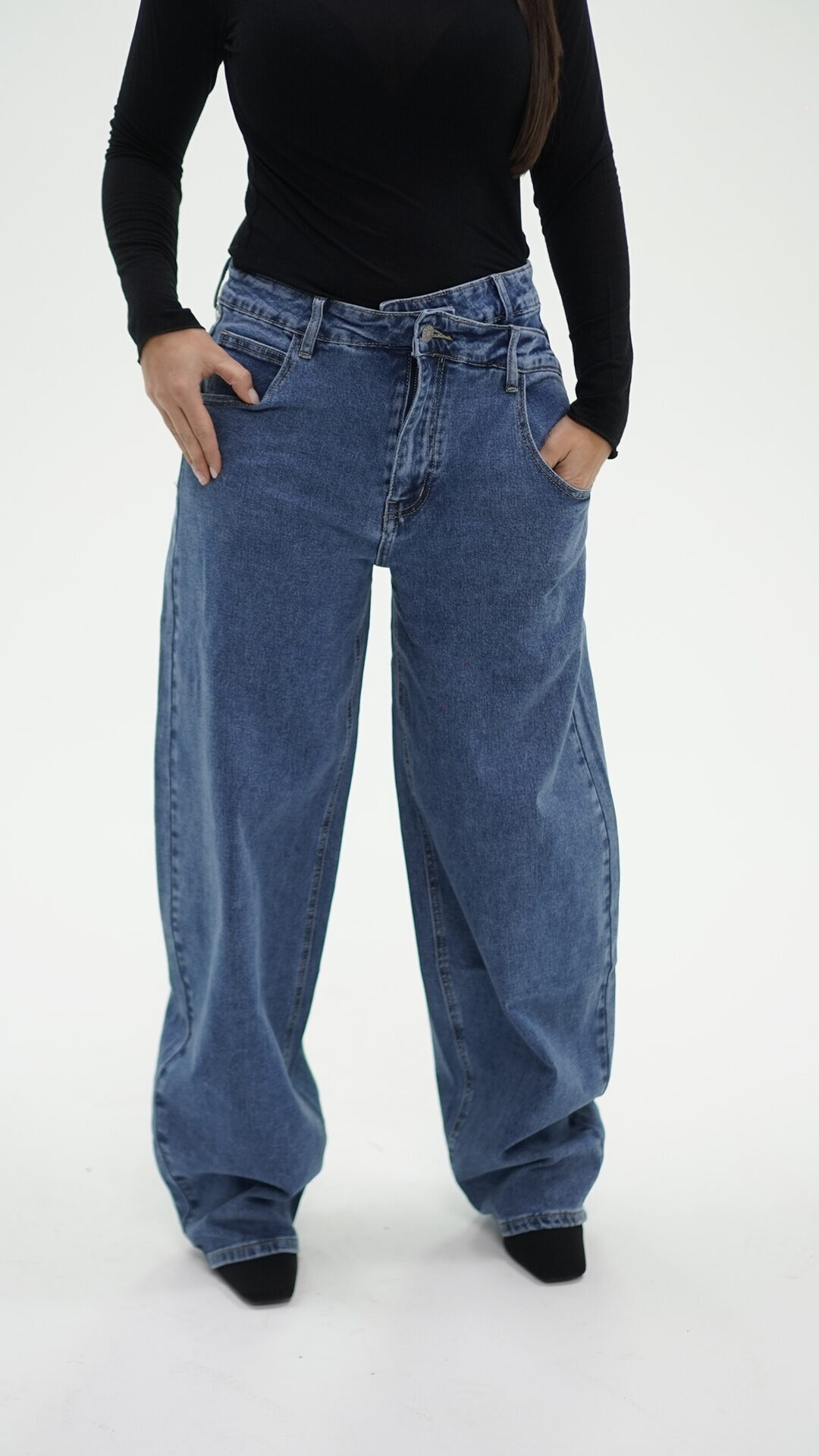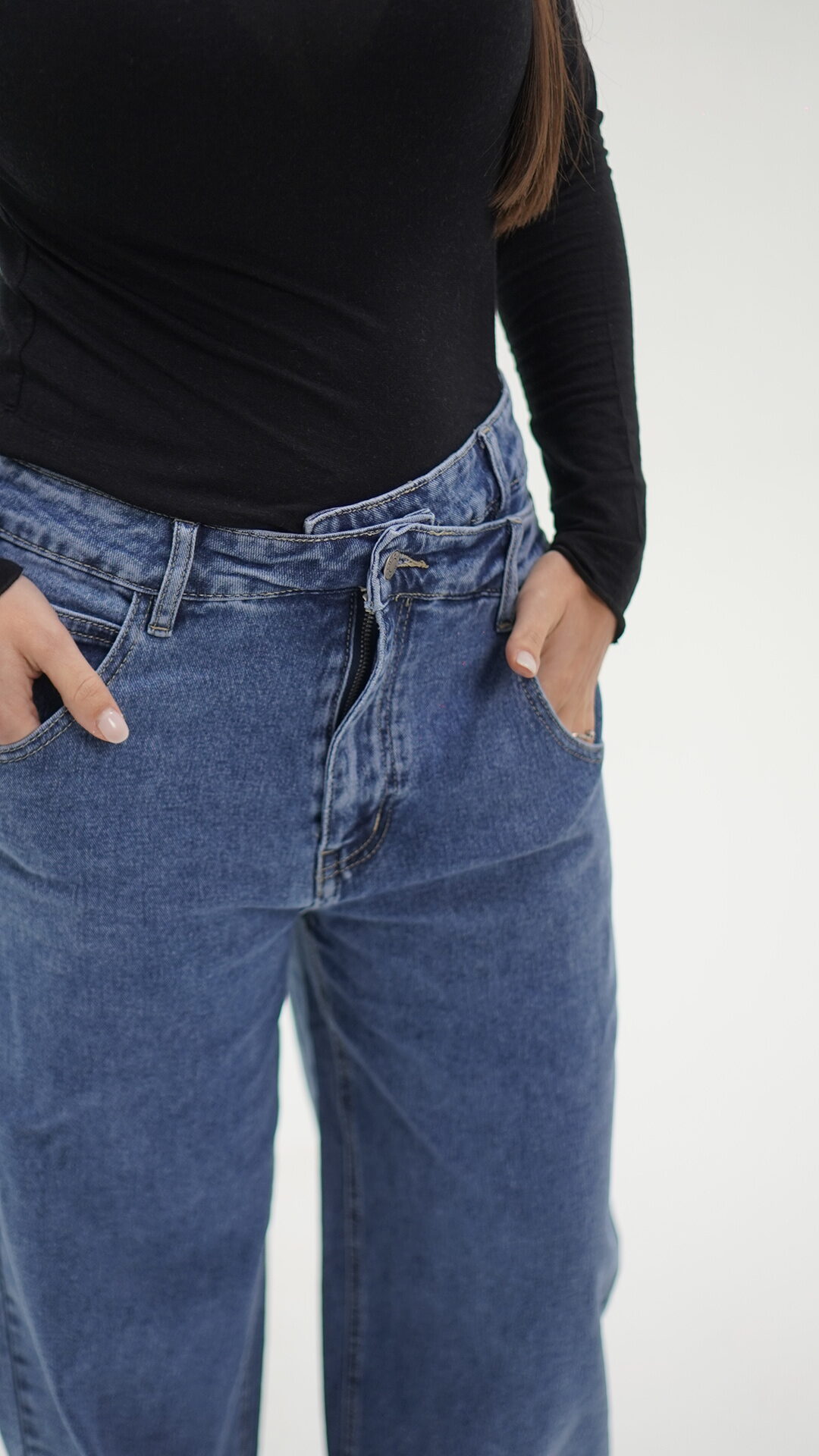 Jeans con taglio asimmetrico con chiusura di due bottoni, idoneo sia in vita alta che bassa.