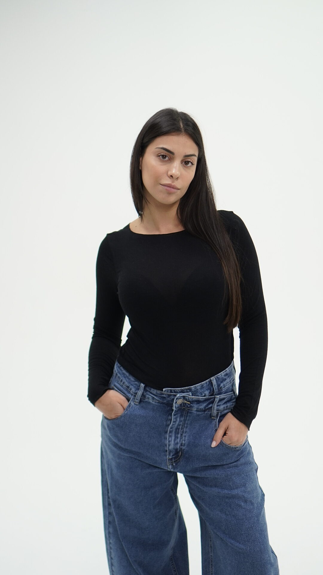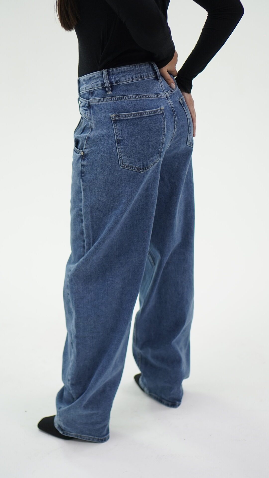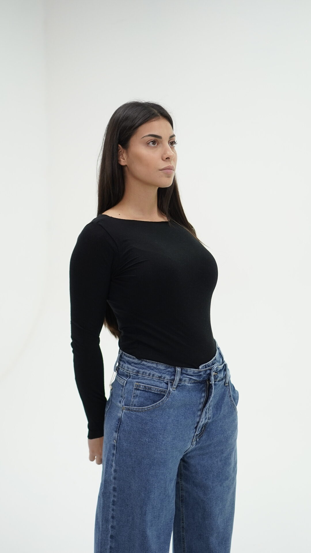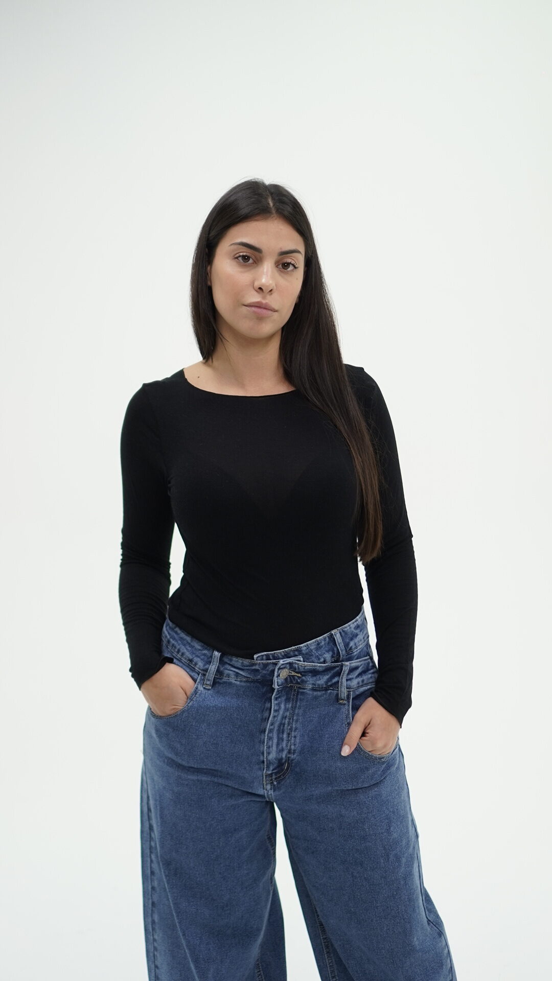Jeans con taglio asimmetrico con chiusura di due bottoni, idoneo sia in vita alta che bassa.