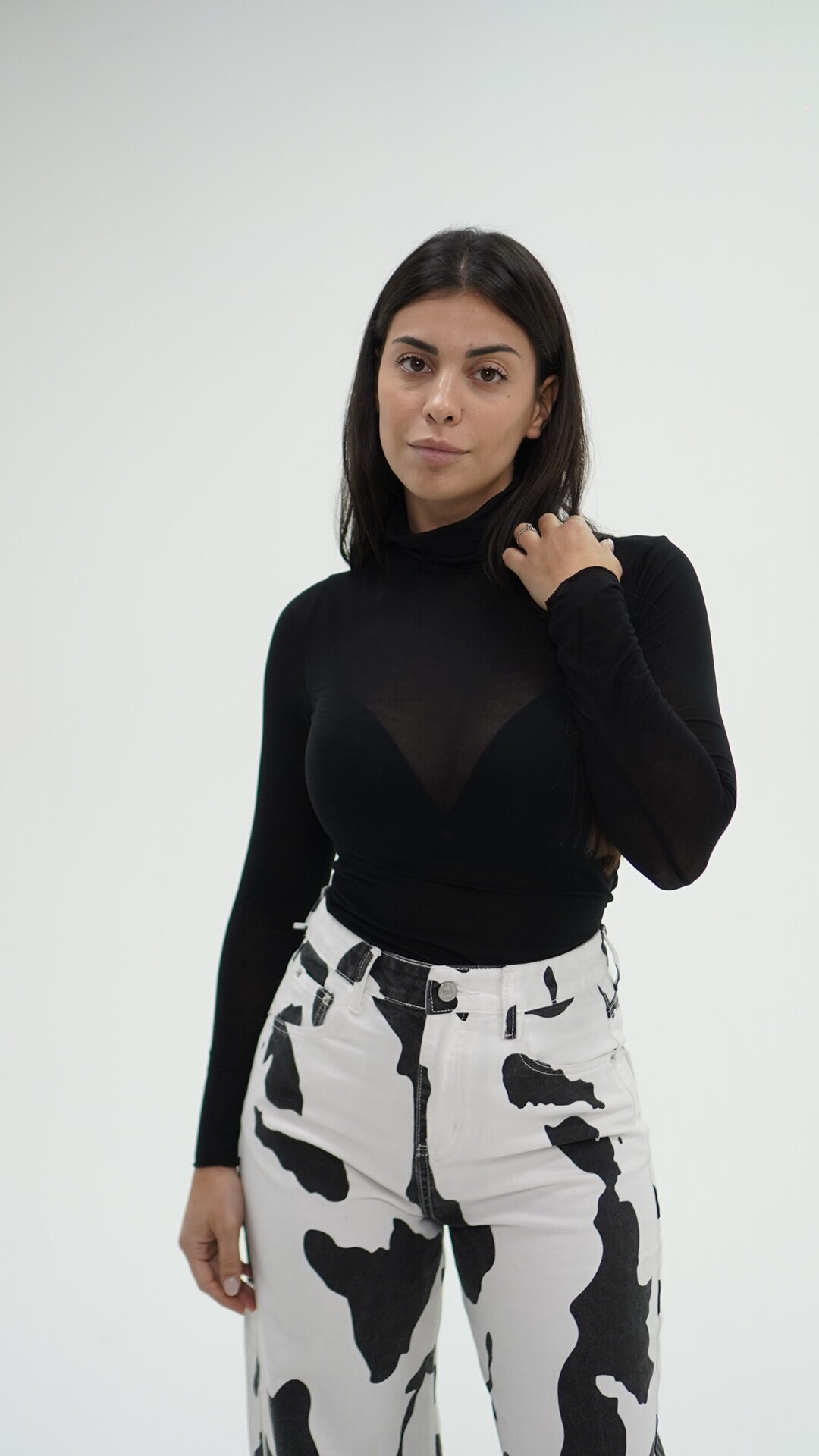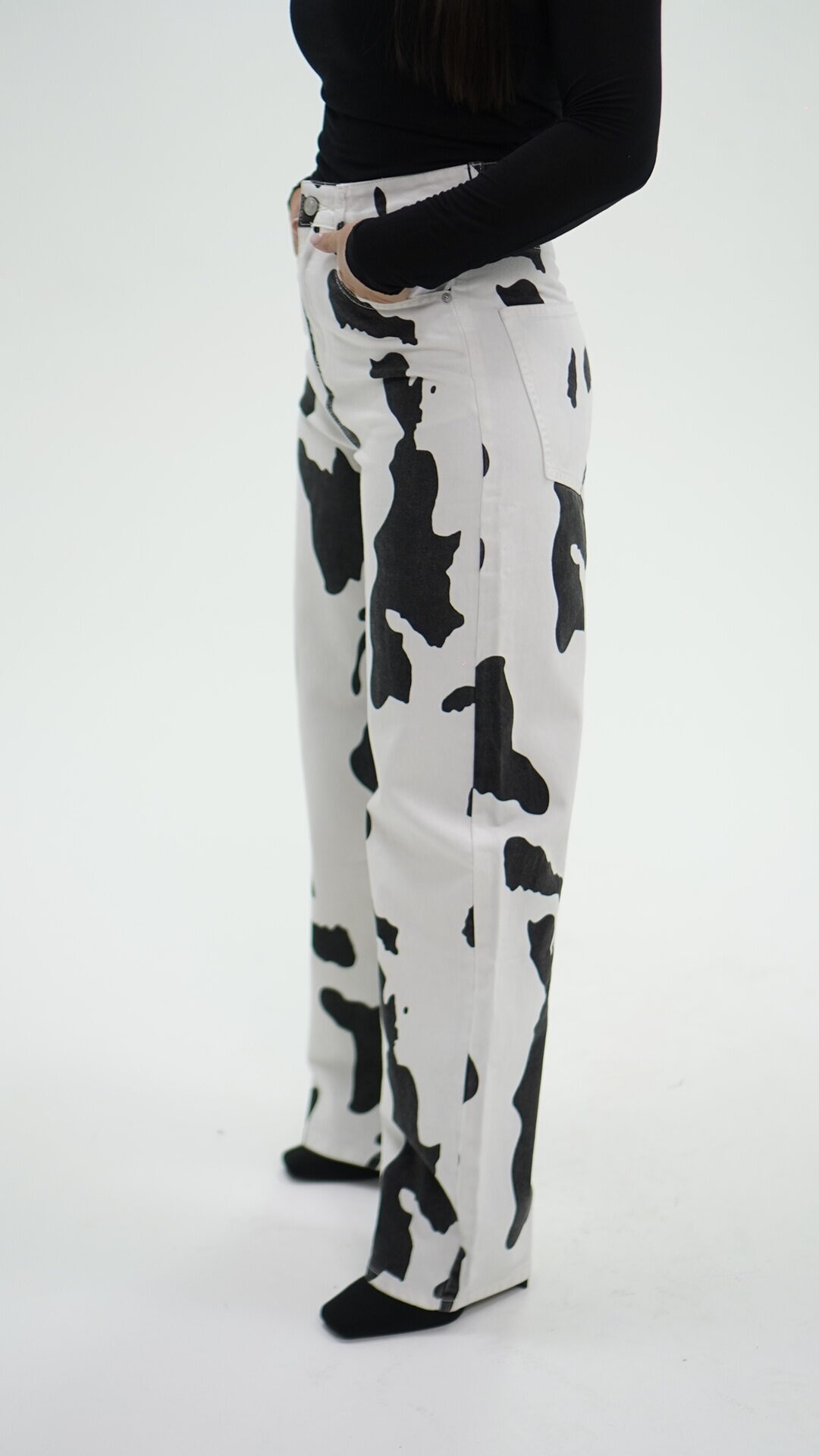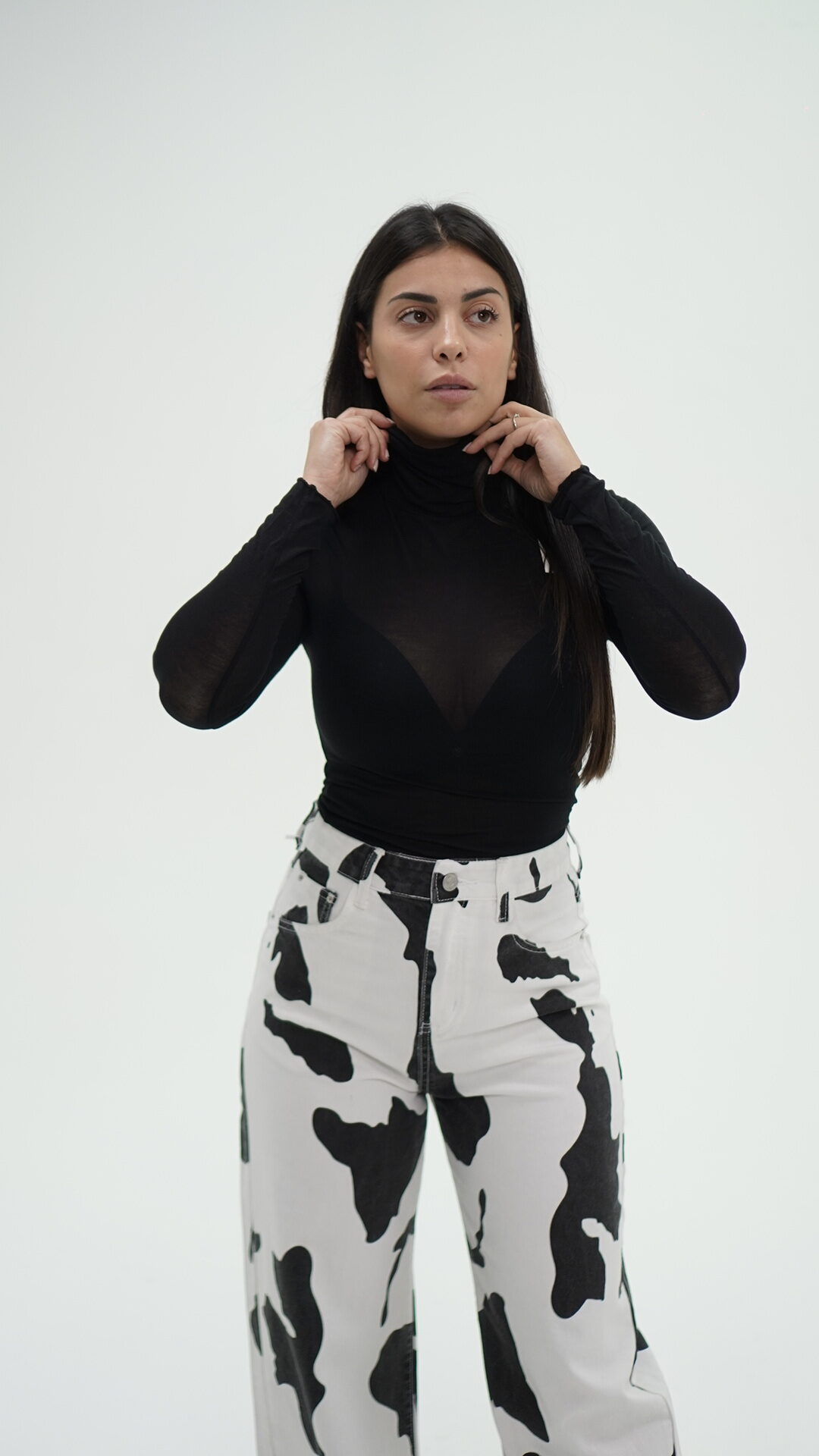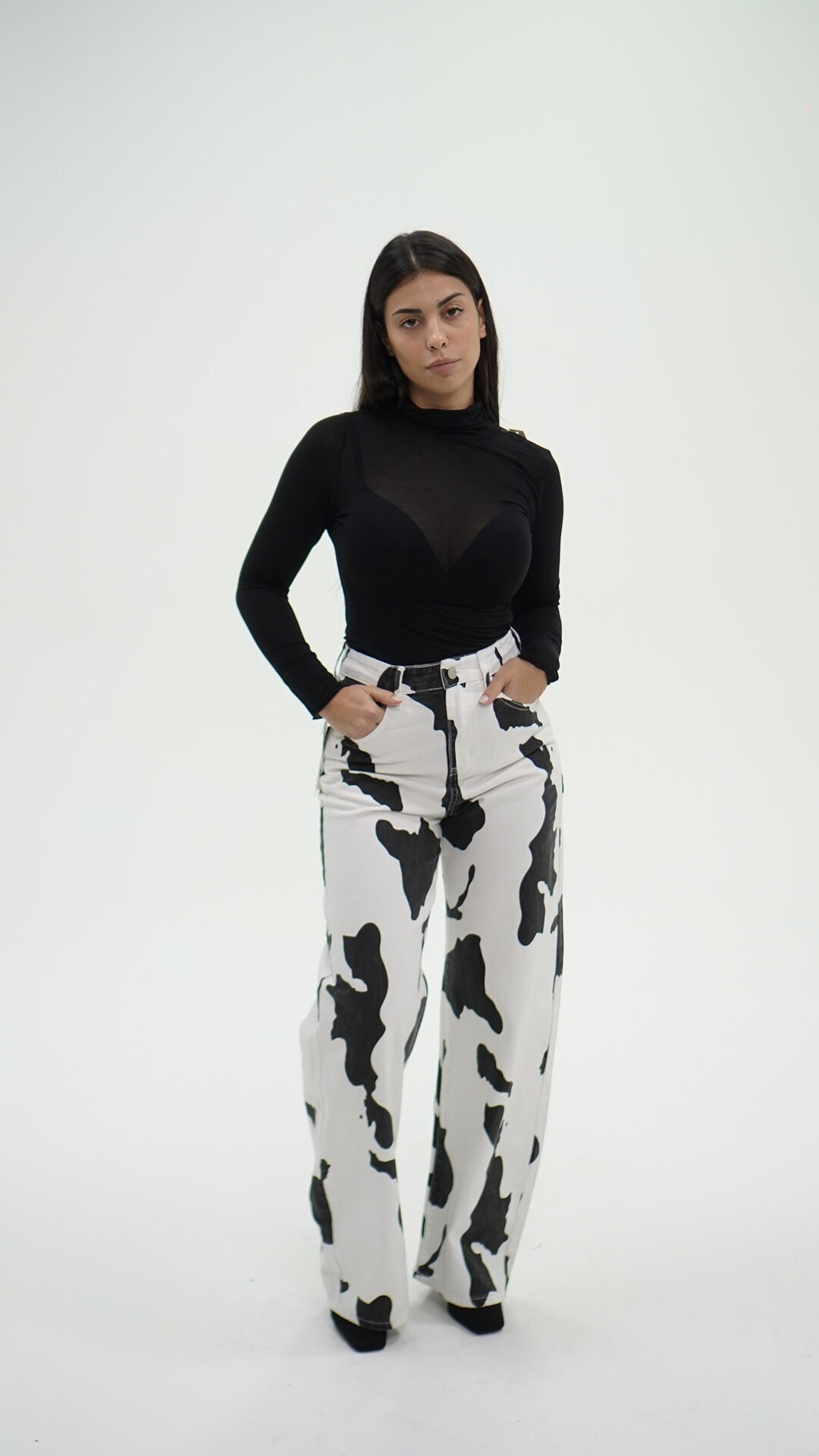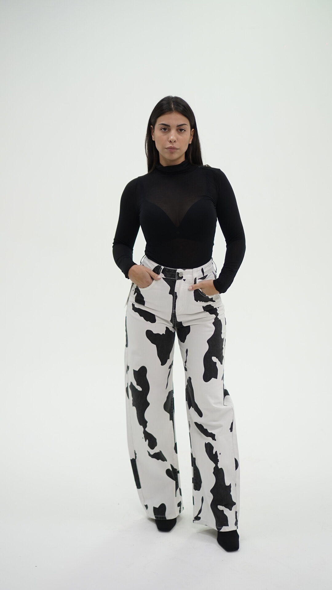 Jeans muccato a palazzo, idoneo indossato sia a vita alta che bassa.