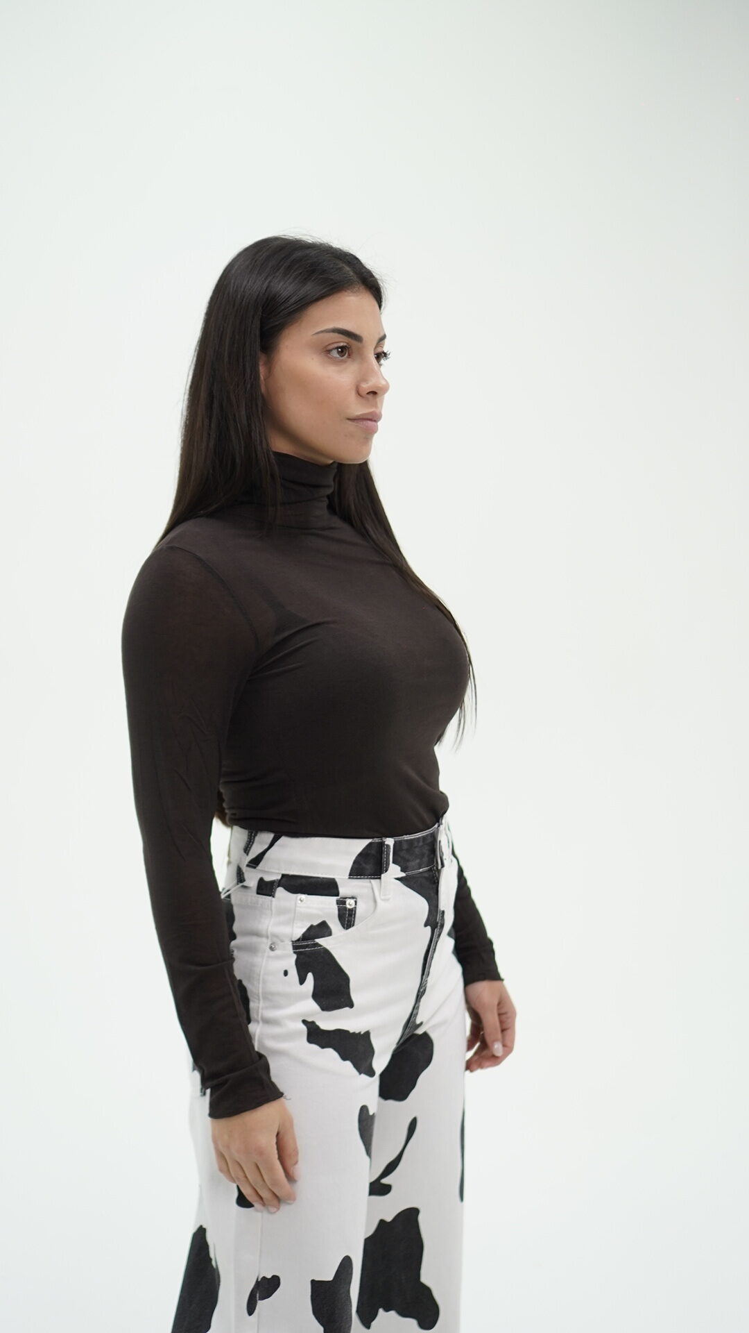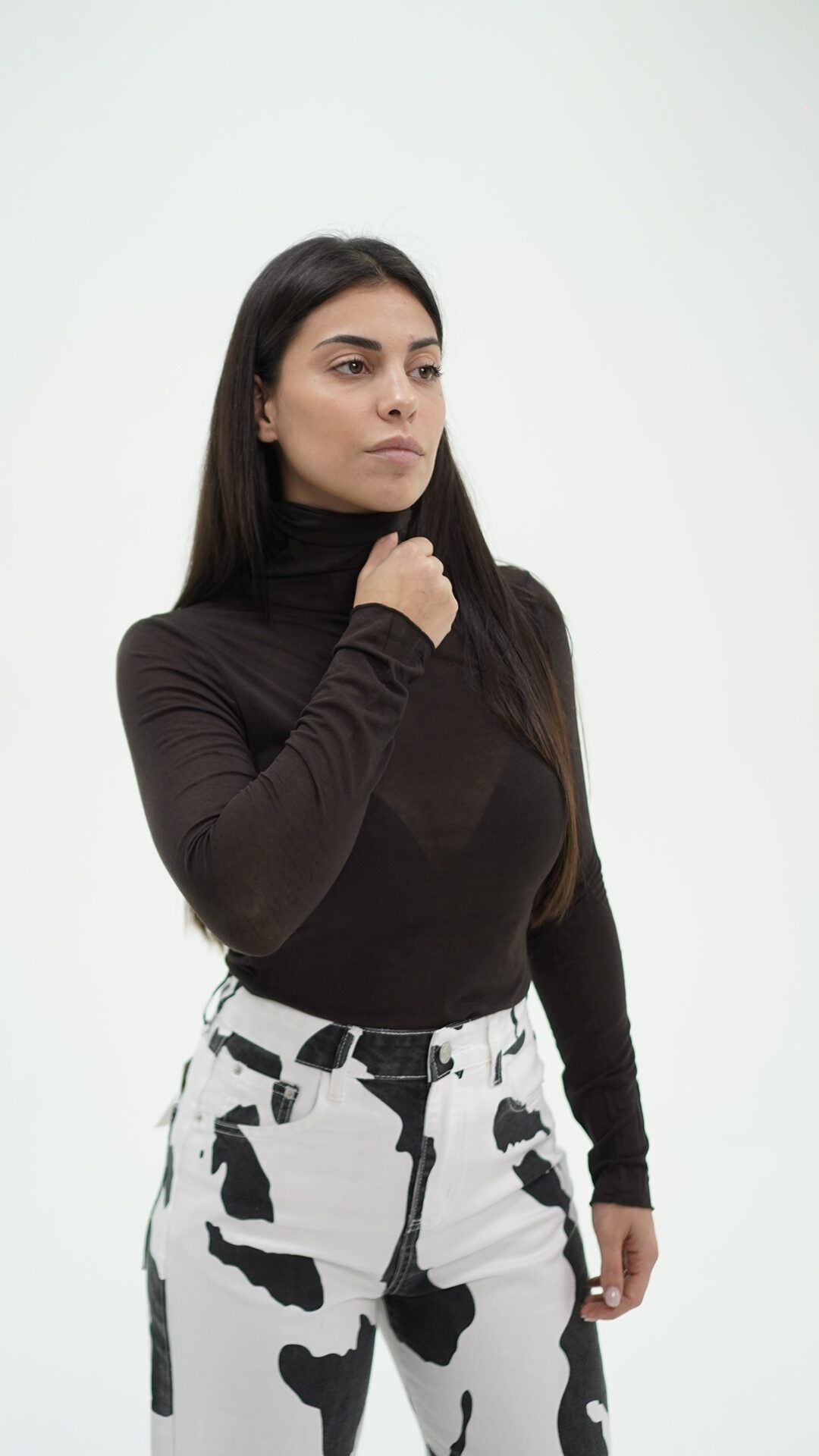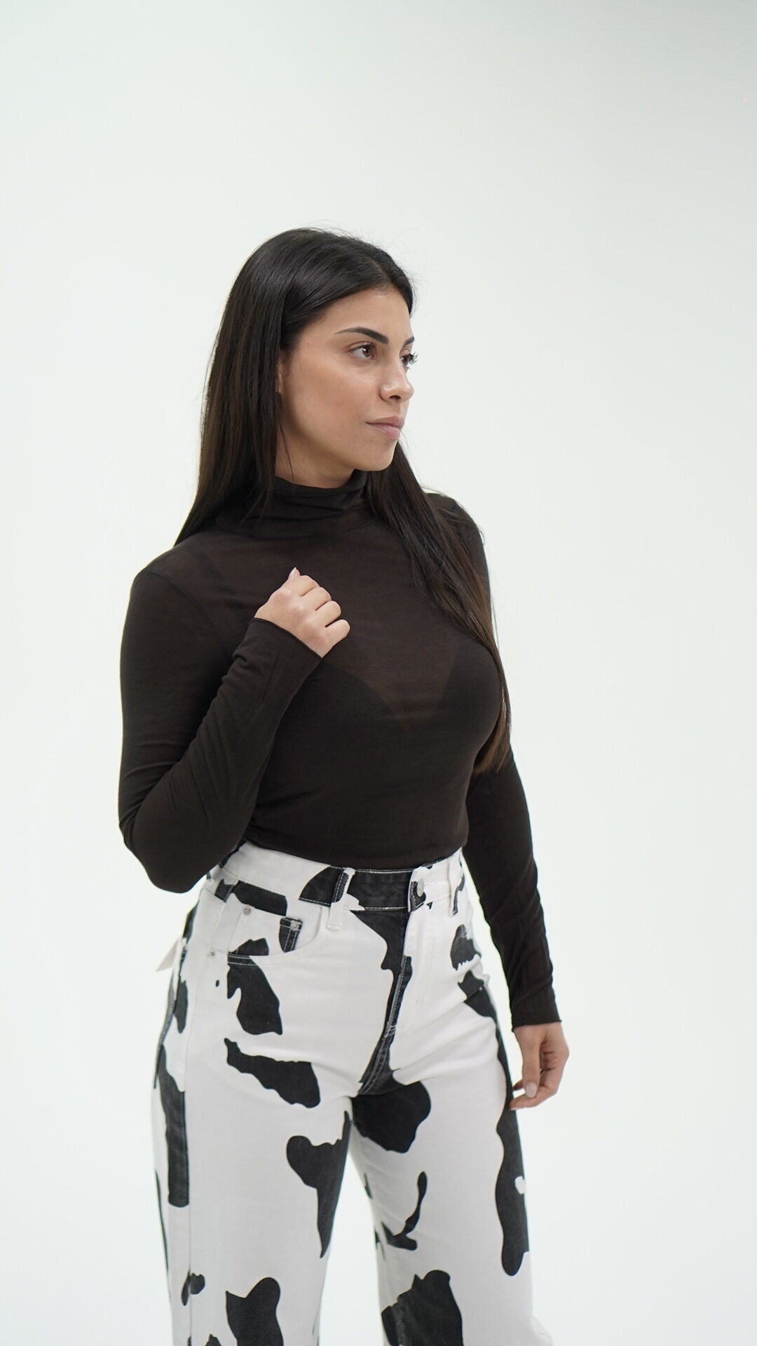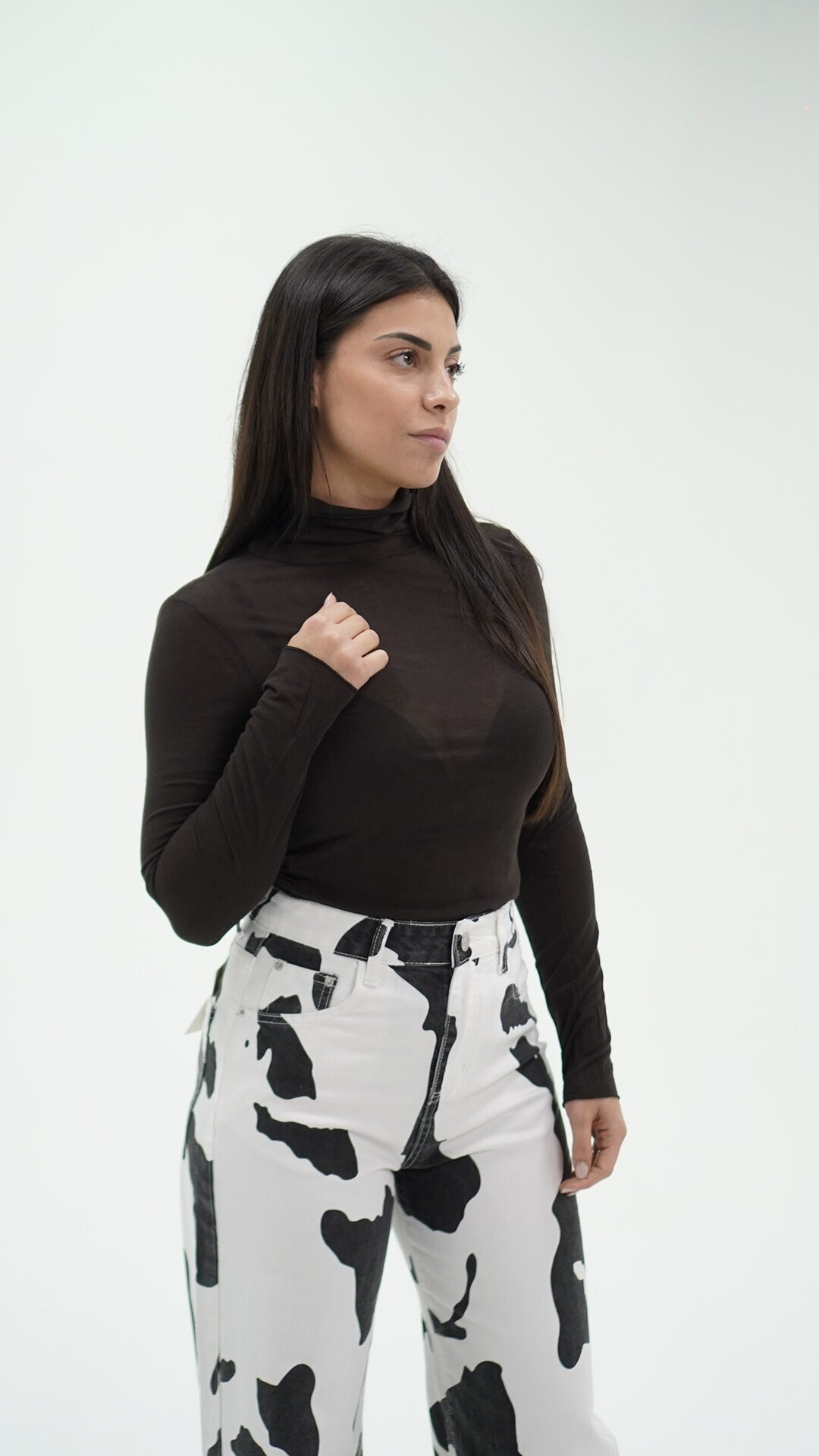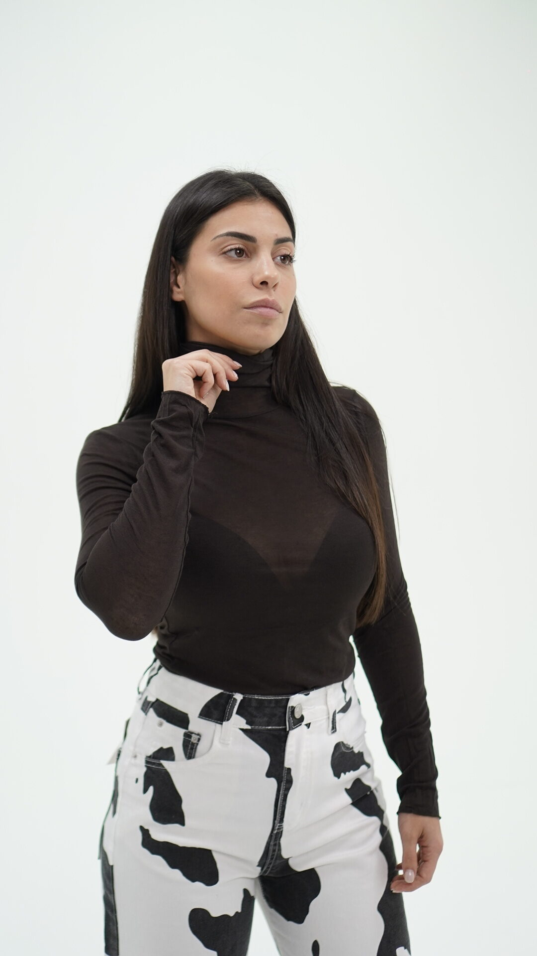 Maglietta trasparente, morbidissima al tatto a collo alto, taglia unica.